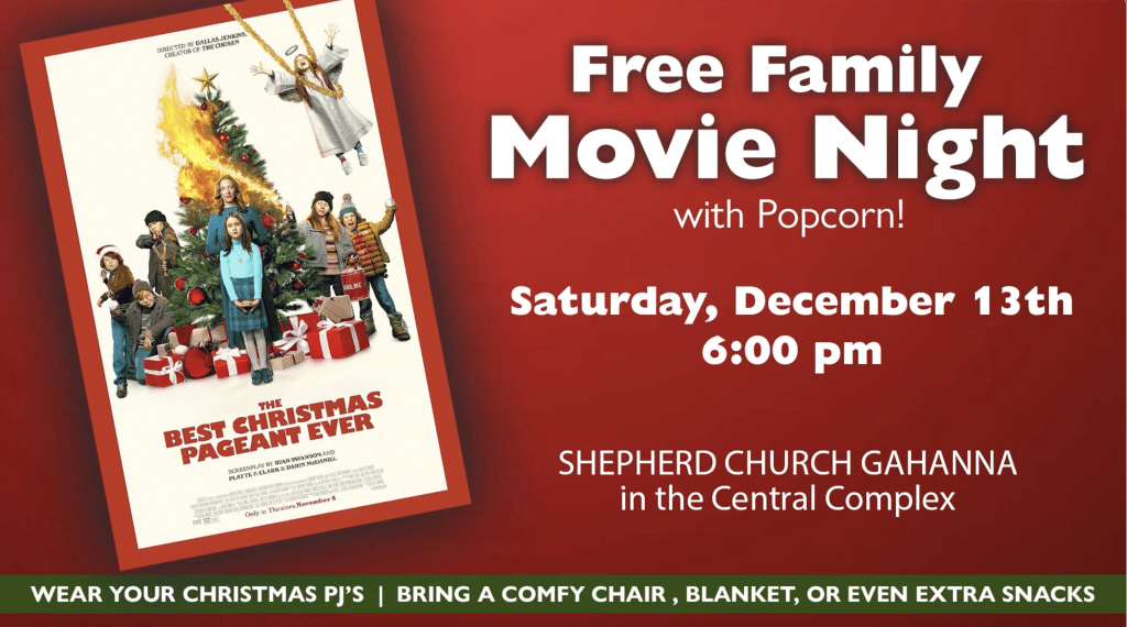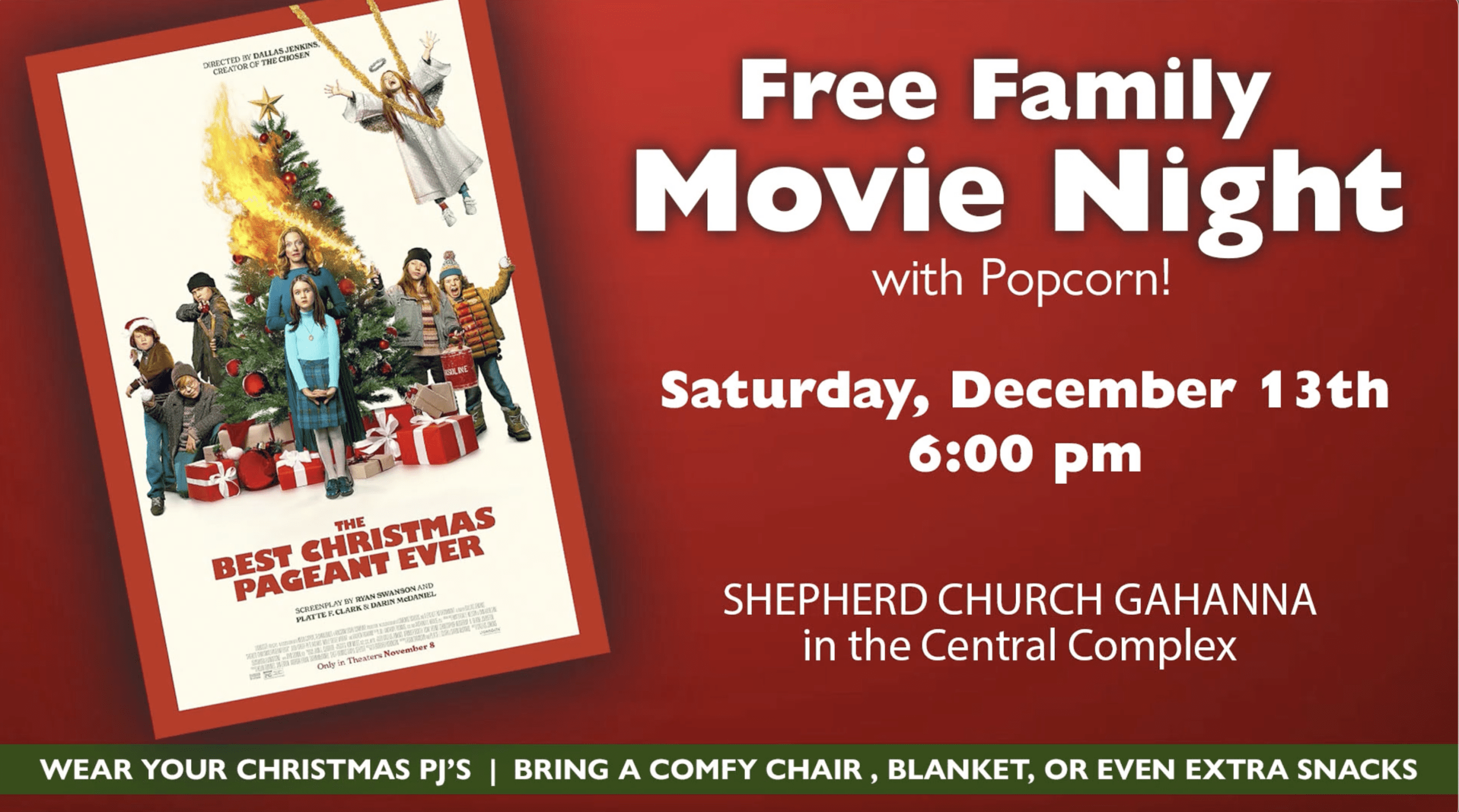 SATURDAY ||| DECEMBER 13 ||| 6:00 PMWatch Party for The Best Christmas Pageant Ever!In the Central Complex - Wear your Christmas PJ's, Bring a comfy chair, Blanket,